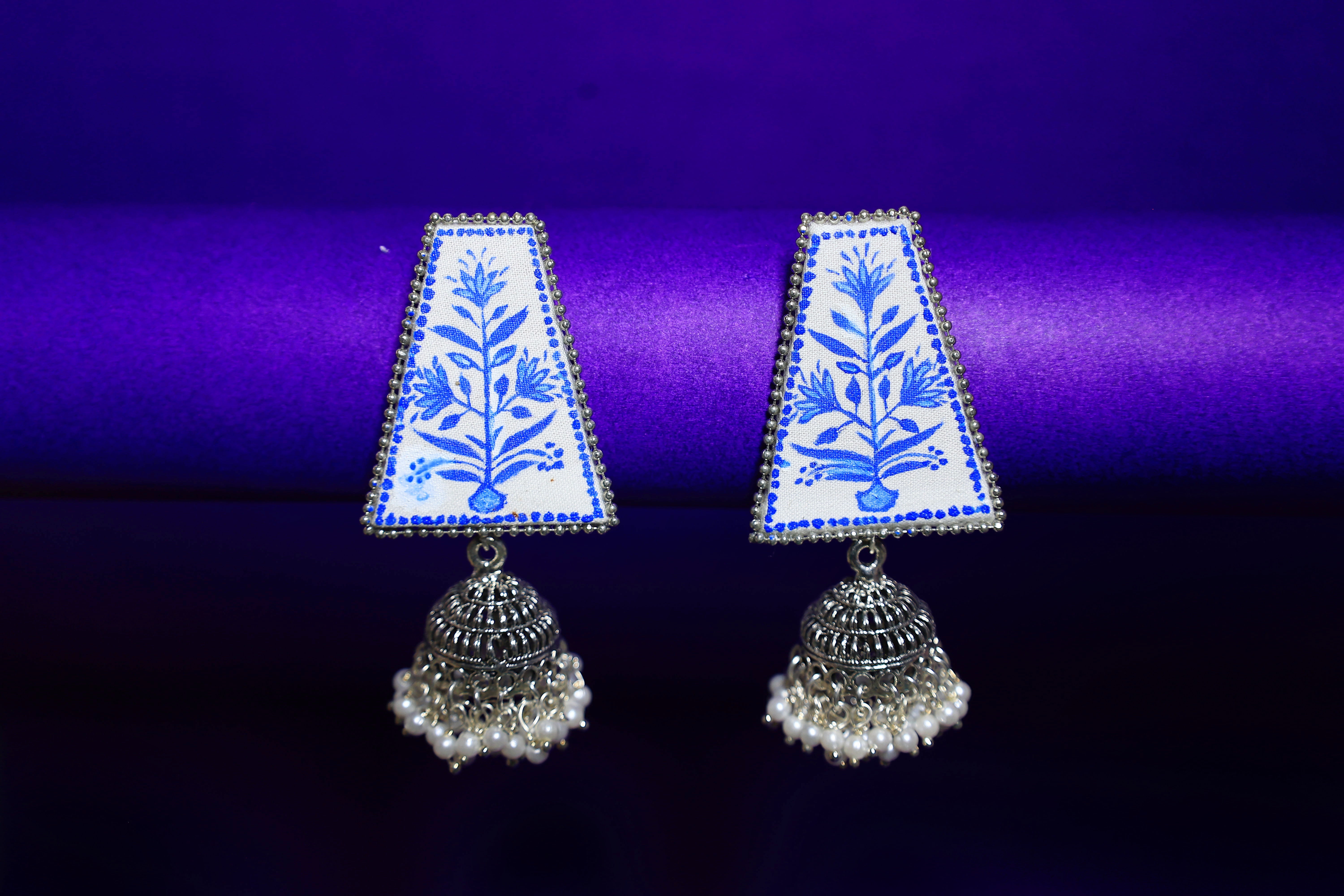 These handcrafted earrings feature an elegant trapeze-shaped top, hand-painted with intricate blue motifs inspired by traditional blue pottery. The royal blue detailing adds a rich and refined charm, making the piece timeless and classy. Paired with an oxidised silver jhumka adorned with delicate petal and pearl detailing, these earrings exude a graceful traditional appeal.