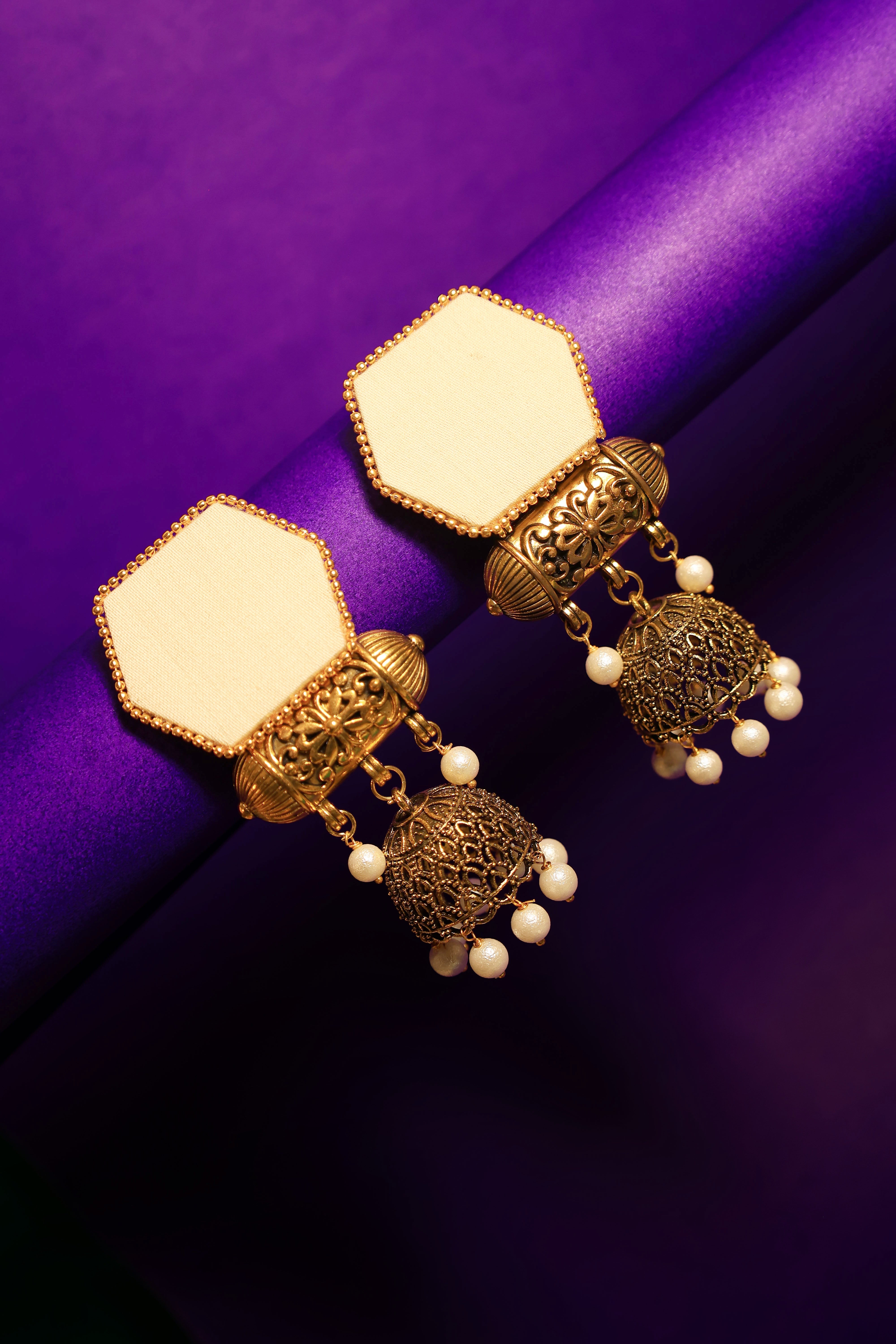 Ivory Bloom earrings are beautifully made with pearl beadwork, giving them a unique and elegant look. Paired with a lightweight oxidised jhumka, these earrings stand out and suit almost any outfit.
